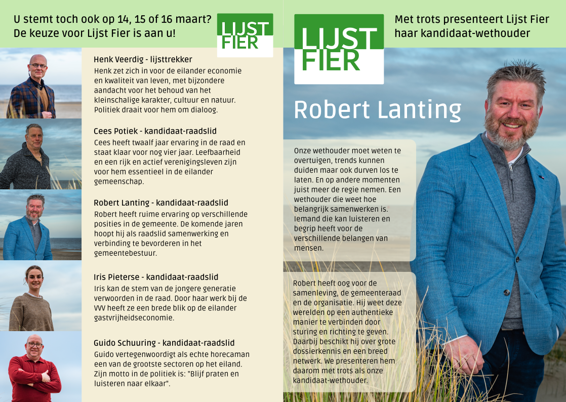 Lijst Fier is een partij in de gemeenteraad van Vlieland waarvoor ik de campagne mocht vormgeven. Hiervoor werkte ik samen met een tekstschrijver (voor het partijprogramma) en een fotograaf.